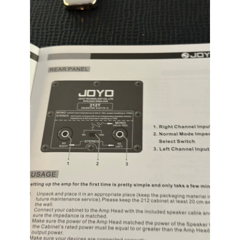 Two input modes give the JOYO 212V more options when coupled with a common guitar amplifier heads. Using the "Normal" option, a switchable 4/16ohm input utilises the 2 speakers as a mono with 120W power handling. In stereo mode, each input jack connects to an individual speaker, 60W at 8ohms power handling.