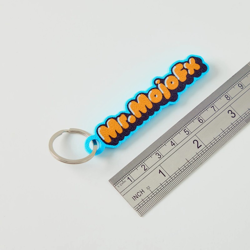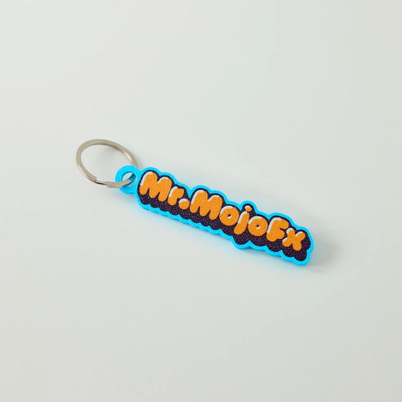 A vibrant key fob showcasing the full colour Mr.MojoFx logo.