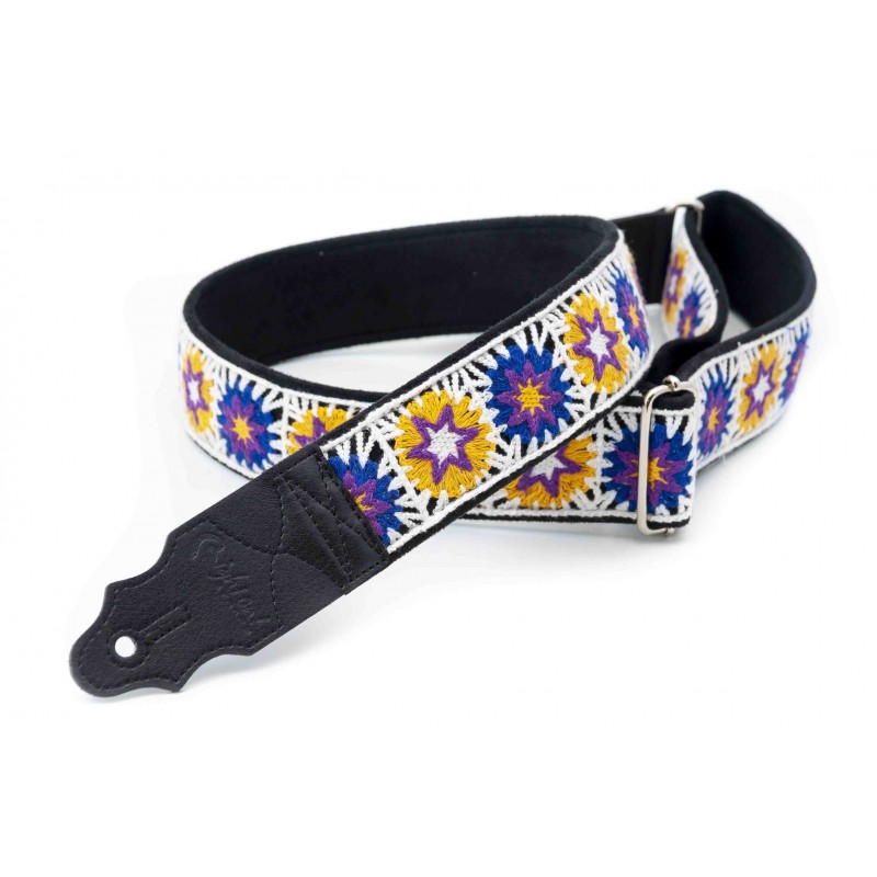 Correa para guitarra y bajo fabricada en 5 cm de ancho, Su acolchado brinda comodidad, mientras que el ajuste mediante anilla corredera permite personalizar la longitud a tu estilo. Inspirada en la artesanía hippie, la superficie tejida con ganchillo evoca la nostalgia de los tiempos de las abuelas, fusionando moda y de tiempos pasados, pero con un look super actual.