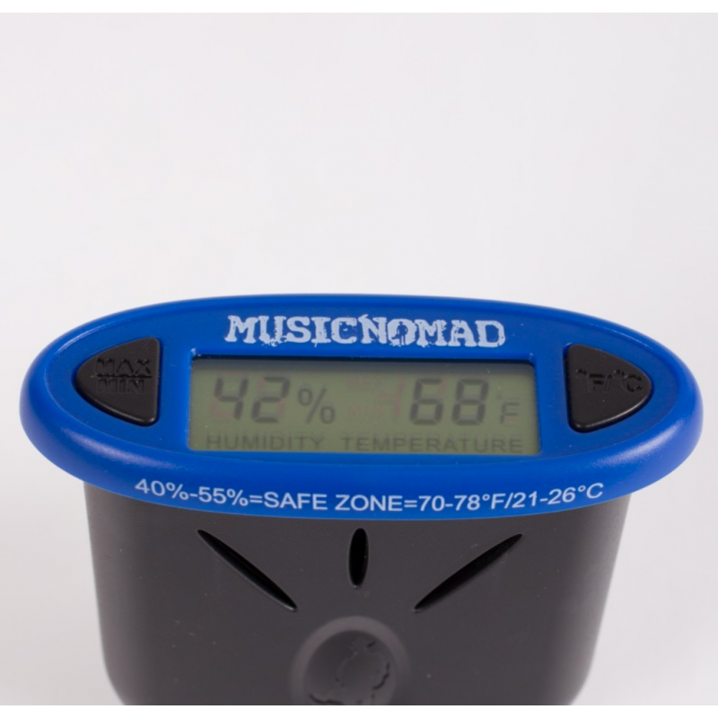 Proteger sus instrumentos de cuerda ahora es más fácil. Music Nomad, el líder en productos para el cuidado de equipos, ha desarrollado el HumiReader, un monitor higrómetro de humedad y temperatura pendiente de patente que es preciso, y fácil de usar. Perfecto para guitarras acústicas, guitarras eléctricas, mandolinas, ukeleles y cuerdas orquestales. Monitorear el entorno de su instrumento es fundamental para garantizar que se mantenga dentro de la garantía del fabricante y para proteger su preciado instrumento contra el secado, deformación, contracción o agrietamiento. Nuestro diseño innovador te permite personalizar donde quieras medir. ¿¡En la boca de la guitarra acústica !? ¡De ninguna manera, SÍ! ¿Dentro de la caja cerca del clavijero o diapasón / diapasón? No hay problema. O simplemente colóquelo en cualquier habitación que desee monitorear. Esa es la calidad de Music Nomad: elevar el nivel en la industria del cuidado de equipos.